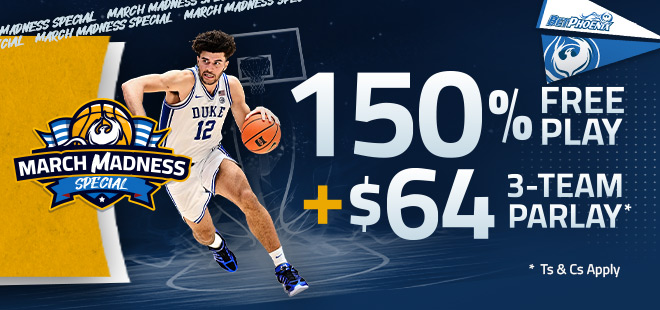 Get ready to turn up the madness this tournament season with an exclusive BetPhoenix boost! Lock in a 150% Free Play Bonus on your deposit and take your shot with an extra $64 3-Team Parlay Free Play on March Madness matchups. It’s the perfect combo to stretch your bankroll and chase bigger wins when the action heats up.